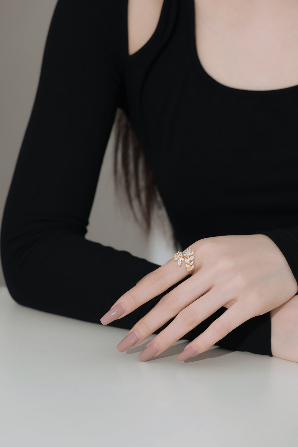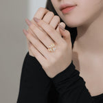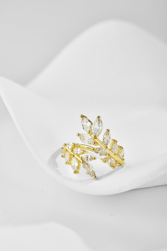 The ring is a "Dream garden" – a cluster of gilded branches wrapped around marquise-cut crystals, like sunlight in an olive branch. The open, organic silhouette wraps around your fingers, like a secret garden you carry with you. It is unabashedly romantic, yet sharp: the golden warmth softens the edges of the crystal, which is perfect for a linen blazer or sundress. Put it on, and your hand becomes a little patch of overgrown elegance -