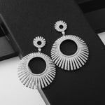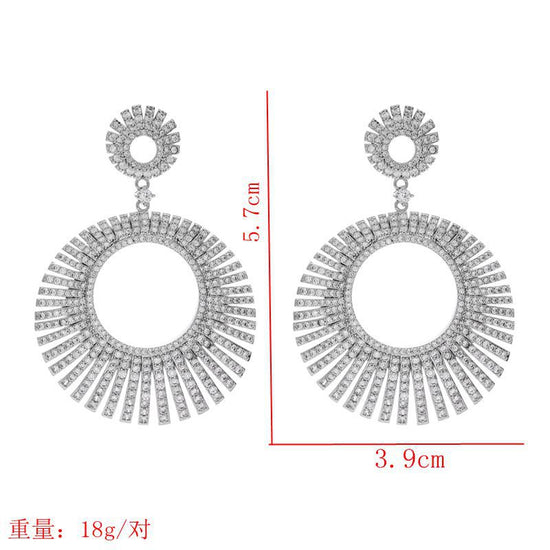 These sunburst circle statement earrings are unapologetically bold—crafted as a radiant halo of pavé stones that catch light like a thousand tiny stars. The layered circular design (a mini sunburst top, a dramatic full-size sunburst drop) adds dimension, while the open-center silhouette keeps the look modern, not overwhelming.